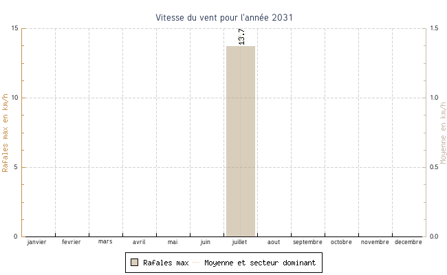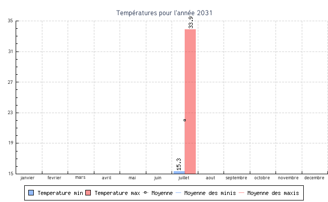 | juillet | 15.3 °C | 17.5 °C | 33.9 °C | 28.1 °C | 22.0 °C | 1.5 km/h | 13.7 km/h | O |